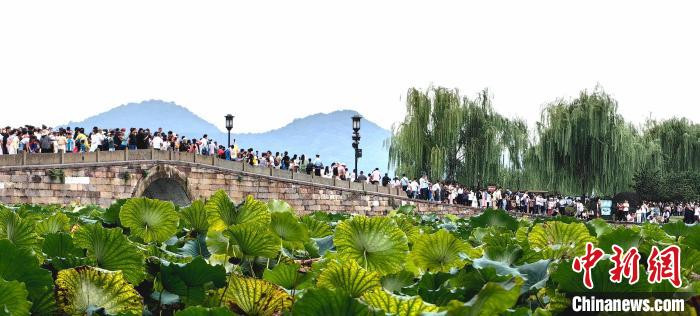 2023年中秋國慶假期里,杭州西湖斷橋上游人如織?!〗厩?攝