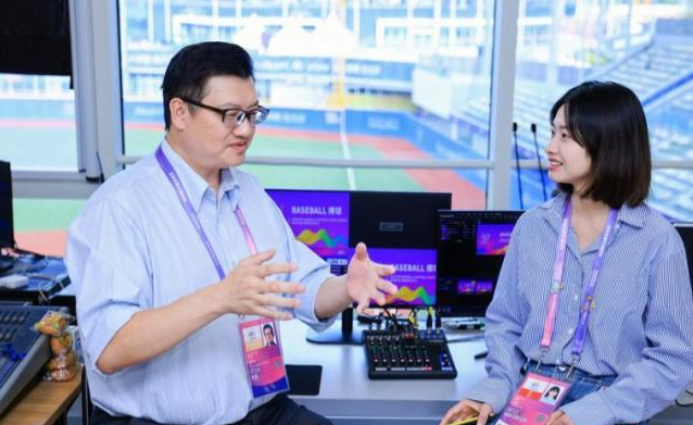 亞運(yùn)棒球項(xiàng)目體展導(dǎo)演(左)接受記者專訪。穆道亮 攝