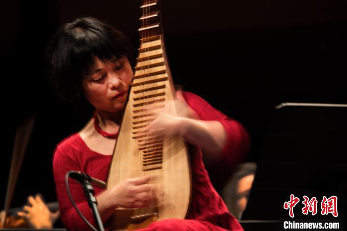 當(dāng)?shù)貢r(shí)間10月4日,第六屆紐約中國(guó)當(dāng)代音樂節(jié)在紐約林肯中心舉行巴德東西樂團(tuán)專場(chǎng)音樂會(huì)。圖為琵琶演奏家吳蠻與樂團(tuán)一起演繹周龍重新編曲的琵琶與樂隊(duì)作品《霸王卸甲》。中新社記者 廖攀 攝