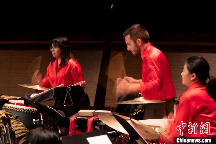 當(dāng)?shù)貢r(shí)間10月4日,第六屆紐約中國(guó)當(dāng)代音樂節(jié)在紐約林肯中心舉行巴德東西樂團(tuán)專場(chǎng)音樂會(huì)。圖為樂團(tuán)打擊樂手、來(lái)自匈牙利的丹尼爾·馬泰(中)在音樂會(huì)演奏中。中新社記者 廖攀 攝