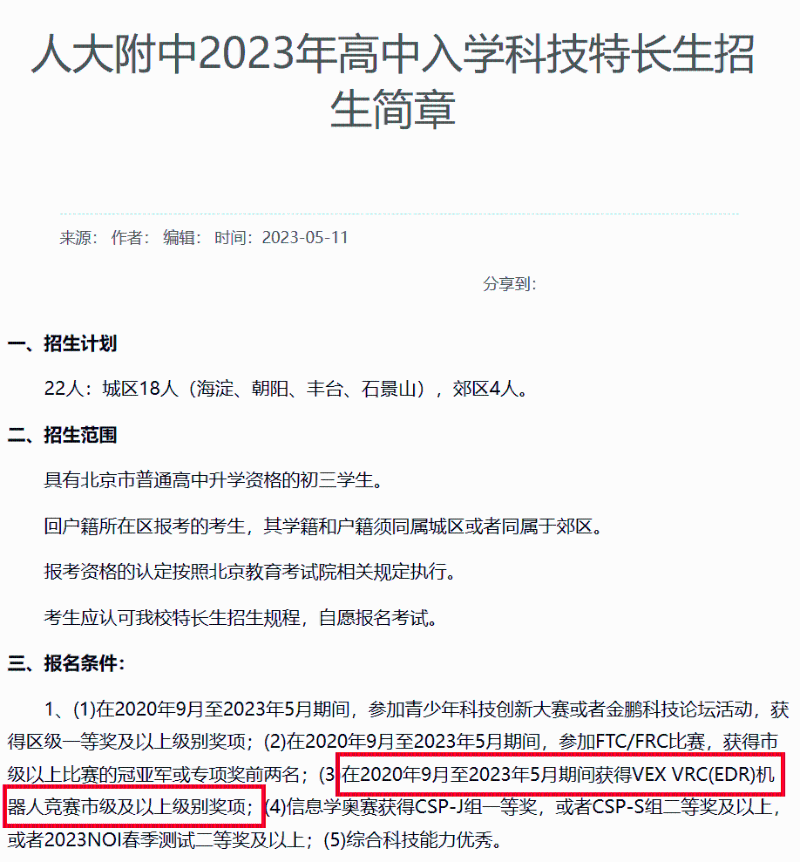 在2023年人大附中和北師大附中近兩年的科技特長生招生簡章中,都明確提到VEX機器人大賽。