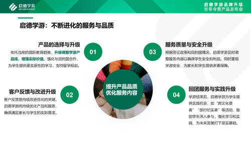 為了滿(mǎn)足學(xué)生和家長(zhǎng)對(duì)高品質(zhì)教育服務(wù)的期待,啟德學(xué)游以專(zhuān)業(yè)的教育視角和市場(chǎng)洞察,不斷創(chuàng)新核心產(chǎn)品。啟德學(xué)游在產(chǎn)品方面進(jìn)行了更精準(zhǔn)的細(xì)分,以更好地滿(mǎn)足不同學(xué)生的需求,提供更具服務(wù)感的體驗(yàn)。這些產(chǎn)品包括:“啟德學(xué)游??Global Study Tour”,為學(xué)生提供國(guó)際化的學(xué)術(shù)體驗(yàn);“啟德研學(xué) Study Tour”,讓學(xué)生深度探索國(guó)內(nèi)文化和科創(chuàng)領(lǐng)域; “啟德?tīng)I(yíng)地??Global Camp”,專(zhuān)為低齡學(xué)生量身定制、幫助他們?yōu)槲磥?lái)的留學(xué)做好準(zhǔn)備。