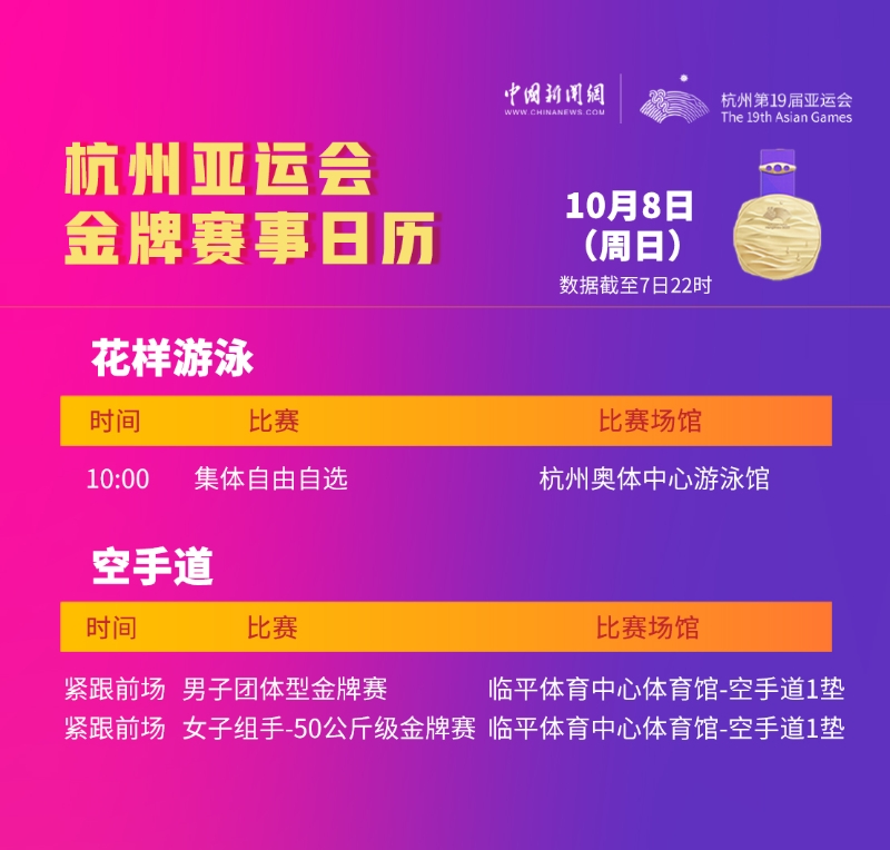 中新網(wǎng)10月8日電 杭州亞運(yùn)會(huì)將于今日閉幕。最后一個(gè)比賽日,花樣游泳和空手道的賽場(chǎng)上將誕生本屆賽事最后3枚金牌。