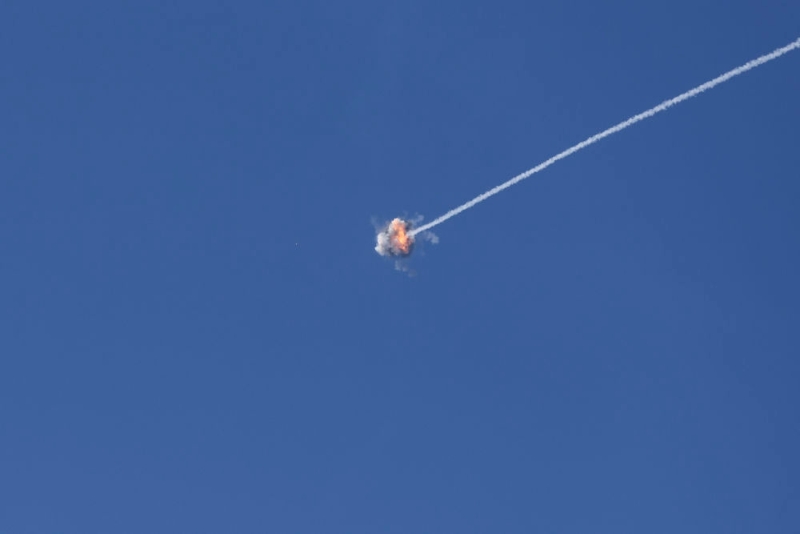 ↑10月7日,在以色列南部城市阿什克隆,以色列“鐵穹”防御系統(tǒng)導(dǎo)彈成功攔截從加沙地帶發(fā)射的火箭彈。新華社發(fā)(伊蘭·阿薩亞格攝/基尼圖片社)