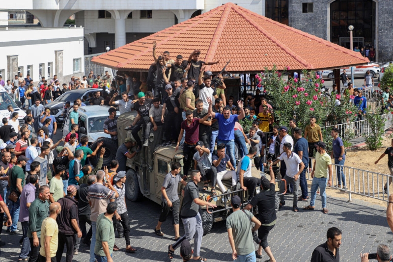 ↑10月7日,在加沙城,巴勒斯坦人登上一輛以色列軍用車輛。新華社發(fā)(里澤克·阿卜杜勒賈瓦德攝)