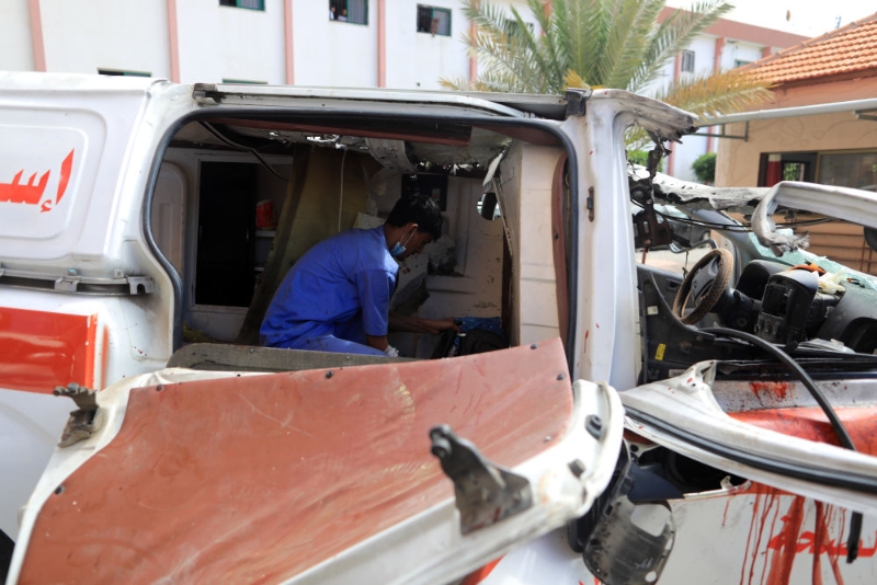 ↑這是10月7日在加沙地帶城市汗尤尼斯拍攝的在以色列空襲中受損的救護(hù)車。新華社發(fā)(哈立德·奧馬爾攝)