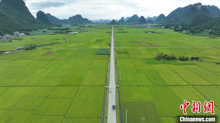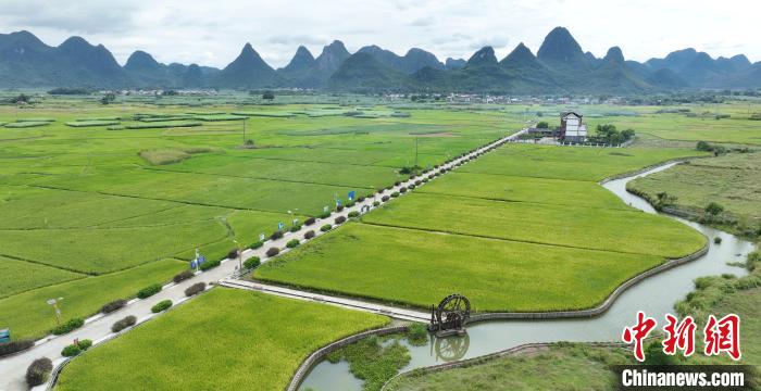 10月7日,在中國唯一的仫佬族鄉(xiāng)——廣西柳州市柳城縣古砦仫佬族鄉(xiāng)廣袤的土地上,水稻與青山、道路相互交融,構(gòu)成一幅絕美的田園畫卷。