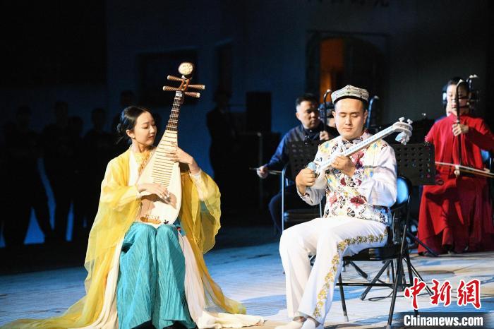 圖為琵琶、熱瓦甫與樂(lè)隊(duì)演奏《天山意象》。中新網(wǎng)記者 孫亭文 攝