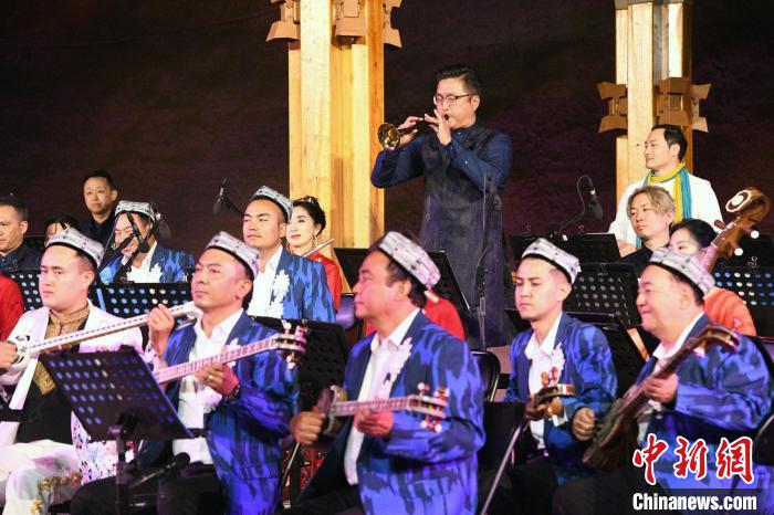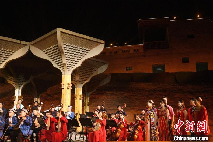 10月7日晚間,由上海民族樂(lè)團(tuán)、喀什地區(qū)歌舞劇團(tuán)聯(lián)袂演繹的《國(guó)樂(lè)詠中華》在新疆喀什市高臺(tái)民居舉辦,兩團(tuán)演奏了《絲綢之路》《天山意象》《花兒為什么這樣紅》《醉山水》《昆侖之春》《新疆是個(gè)好地方》等10個(gè)曲目,為當(dāng)?shù)孛癖姾捅姸嘤慰蛶?lái)了一場(chǎng)民族音樂(lè)盛宴。該演出8日晚間還將再次上演。中新網(wǎng)記者 孫亭文 攝