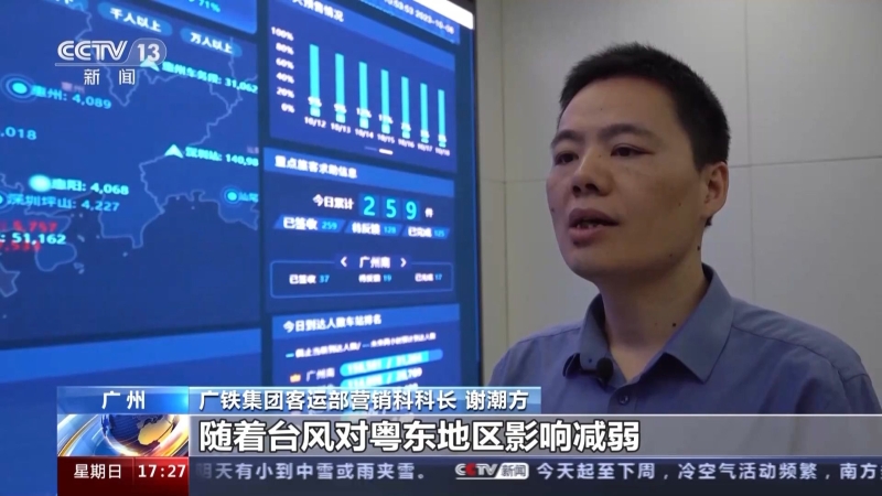 廣鐵集團客運部營銷科科長謝潮方:隨著臺風對粵東地區(qū)影響減弱,今天,杭深、廣汕等線路列車運行秩序恢復正常。中秋國慶假期的后幾天,仍是返程客流高峰,我們將加強線路檢查,確保運輸安全。