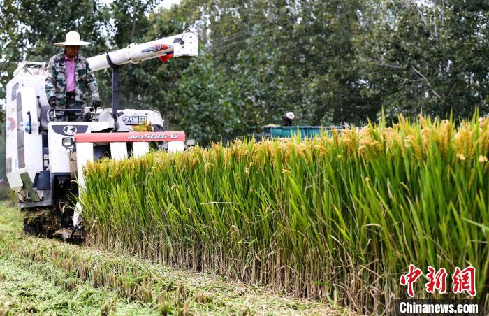 2023年10月7日,在山東省臨沂市郯城縣紅花鎮(zhèn)三堂社區(qū),農(nóng)機(jī)手駕駛收割機(jī)收獲水稻。李結(jié)義 攝