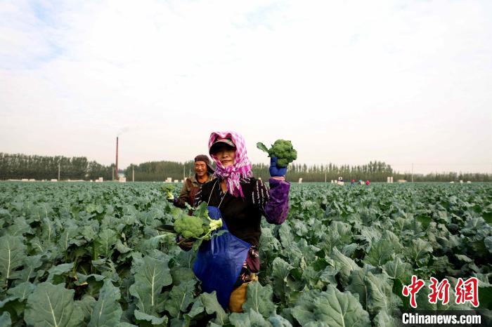 10月7日,在山東省聊城市茌平區(qū)振興街道朝陽社區(qū)蔬菜基地,農(nóng)民在采收西藍(lán)花。馬紅坤 攝