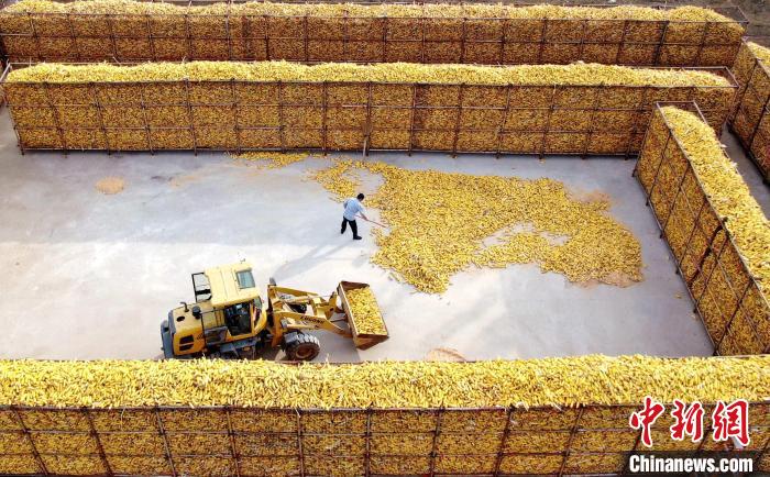 臨沂市沂南縣合勝農(nóng)作物種植專業(yè)合作社工作人員將收獲的玉米裝入臨時糧囤。 杜昱葆 攝