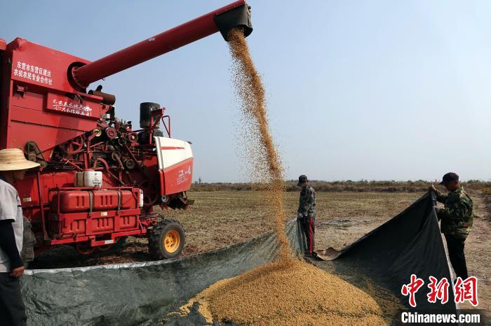 10月8日,中國(guó)科學(xué)院遺傳與發(fā)育生物學(xué)研究所(遺傳發(fā)育所)科研團(tuán)隊(duì)選育的耐鹽高產(chǎn)大豆新品系“科豆35”,在山東省東營(yíng)市黃河入??谝惶廂}堿地試驗(yàn)田里進(jìn)行實(shí)收測(cè)產(chǎn),結(jié)果顯示,“科豆35”大面積示范種植畝產(chǎn)穩(wěn)定達(dá)270公斤以上,最高突破300公斤達(dá)306.52公斤。圖為實(shí)收測(cè)產(chǎn)現(xiàn)場(chǎng)。中新網(wǎng)記者 孫自法 攝