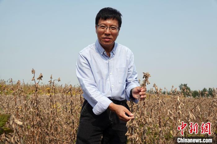 10月8日,中國(guó)科學(xué)院遺傳與發(fā)育生物學(xué)研究所(遺傳發(fā)育所)科研團(tuán)隊(duì)選育的耐鹽高產(chǎn)大豆新品系“科豆35”,在山東省東營(yíng)市黃河入??谝惶廂}堿地試驗(yàn)田里進(jìn)行實(shí)收測(cè)產(chǎn),結(jié)果顯示,“科豆35”大面積示范種植畝產(chǎn)穩(wěn)定達(dá)270公斤以上,最高突破300公斤達(dá)306.52公斤。圖為田志喜研究員在測(cè)產(chǎn)現(xiàn)場(chǎng)介紹“科豆35”選育情況。中新網(wǎng)記者 孫自法 攝