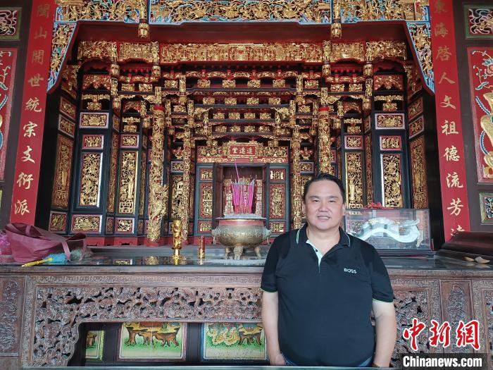 圖為10月8日上午,陳重文在廈門市翔安區(qū)民安街道山亭社區(qū)陳氏家廟尋根謁祖時,拍照留念。中新網(wǎng)記者廖珍妹攝