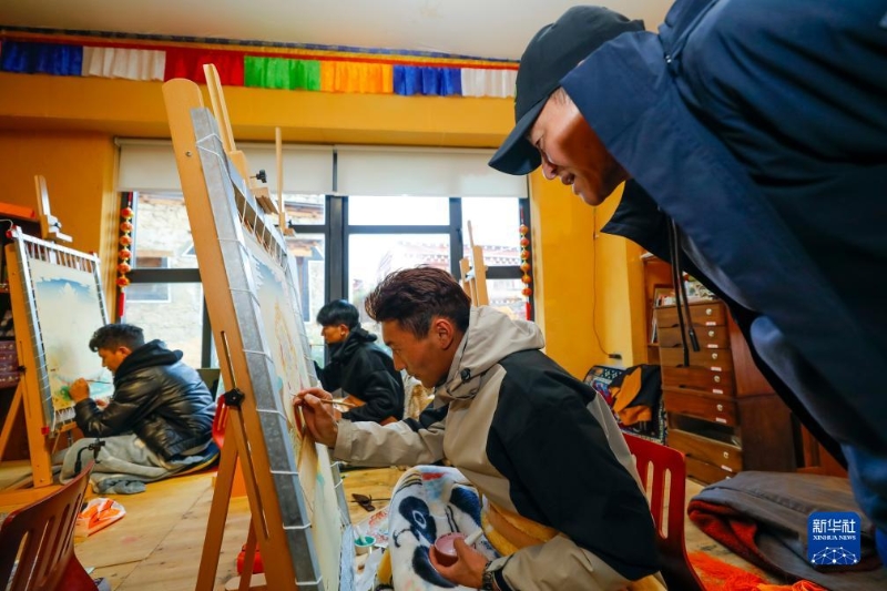 10月10日,游客(右)在理塘縣勒通古鎮(zhèn)的“唐卡館”觀看當(dāng)?shù)厮囆g(shù)家創(chuàng)作唐卡作品。