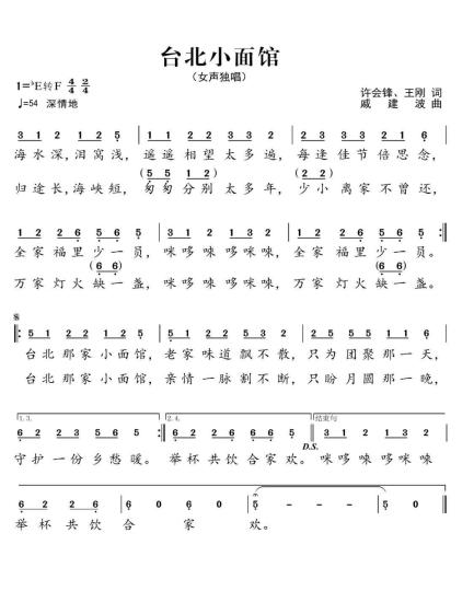 歌曲《臺(tái)北小面館》圍繞中華民族唇齒相依、骨肉相連一家親,海峽兩岸一脈相承、血濃于水一家人的熾熱情感為主線,歌詞通過(guò)“海水深,淚窩淺”“歸途長(zhǎng),海峽短”,抒發(fā)了同胞隔海相望的濃濃思念之情,以及“每逢佳節(jié)倍思念”“少小離家不曾還”,傾訴著親人渴望團(tuán)圓的深深相思。
