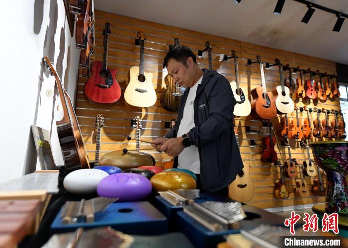 10月7日,游客在周窩音樂小鎮(zhèn)的一家樂器商店體驗空靈鼓?!√K小立 攝