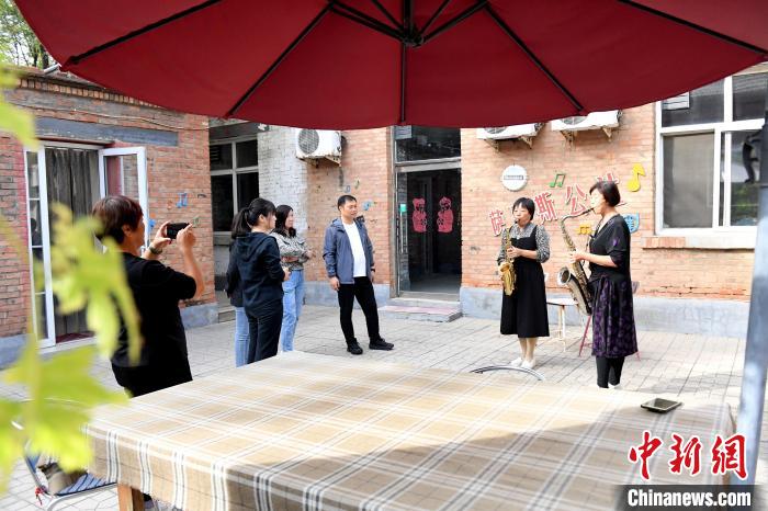 10月7日,游客在周窩音樂小鎮(zhèn)觀看村民演奏薩克斯?!√K小立 攝