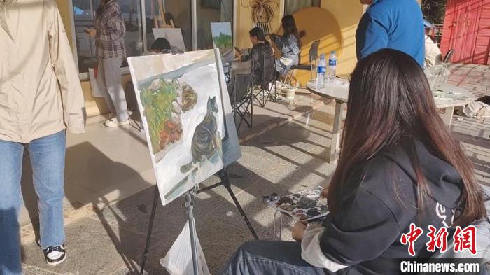 天氣晴暖,10多名大學(xué)生選擇在屋外的緩臺上畫畫,藍天及湖景盡收眼底。畫板、調(diào)色板放置一角。村民們飼養(yǎng)的小貓也來“做客”,大學(xué)生們休息時會用手機拍下這“治愈的瞬間”。
