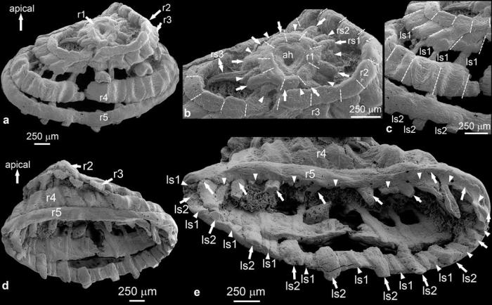 記者了解到,本次研究一共報(bào)道了3枚標(biāo)本,均為毫米級(jí)別。其中1枚保存較好的化石呈現(xiàn)“五環(huán)”狀結(jié)構(gòu),從頂?shù)降子?個(gè)直徑逐漸增大的環(huán)組成。