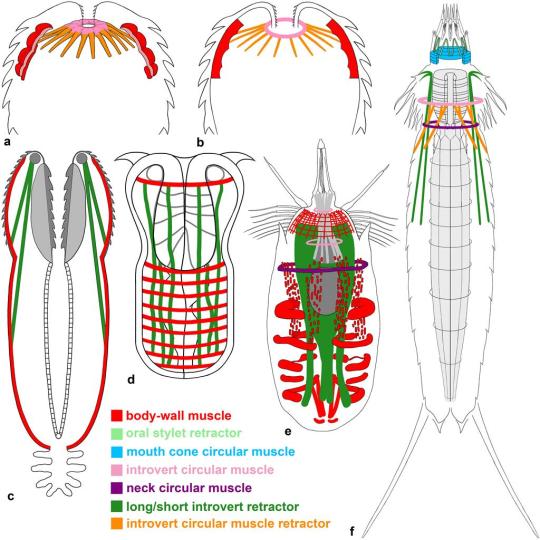 據(jù)科研人員介紹,環(huán)神經(jīng)動(dòng)物是節(jié)肢動(dòng)物的近親,現(xiàn)生類群包括鐵線蟲(chóng)、蛔蟲(chóng)、鰓曳蟲(chóng)等。許多環(huán)神經(jīng)動(dòng)物有可外翻的吻部,因此又被稱為翻吻動(dòng)物。