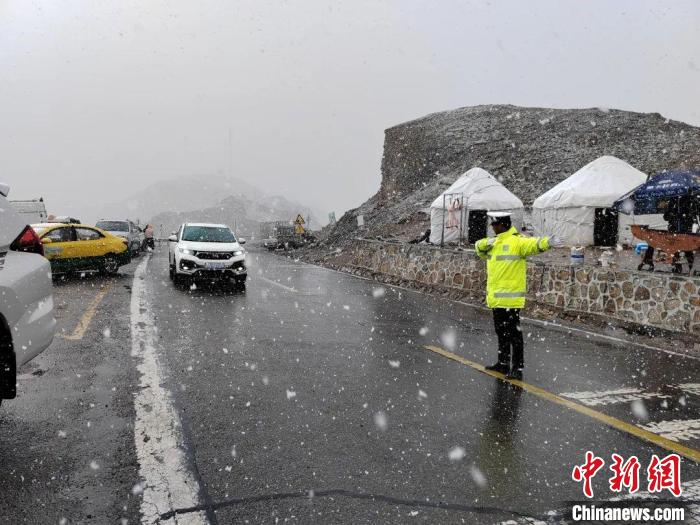 新疆察布查爾縣交警在伊昭公路上指揮機(jī)動(dòng)車通行。(新疆公安廳交通警察總隊(duì)提供)
