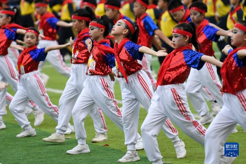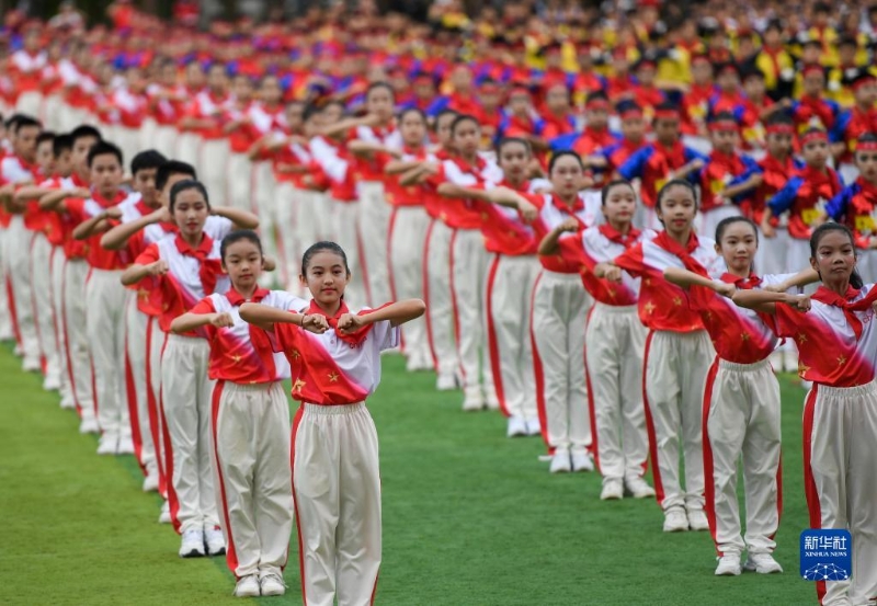 10月11日,參加活動(dòng)的少先隊(duì)員表演第三套全國(guó)小學(xué)生廣播體操《七彩陽(yáng)光》。