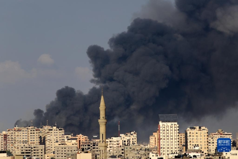 10月11日,加沙城的建筑遭以色列空襲后升起濃煙。