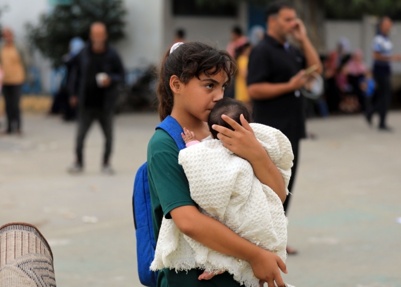 10月9日,巴勒斯坦人在加沙地帶南部城市汗尤尼斯的一所學(xué)校躲避以色列空襲。新華社發(fā)(亞西爾·庫迪攝)