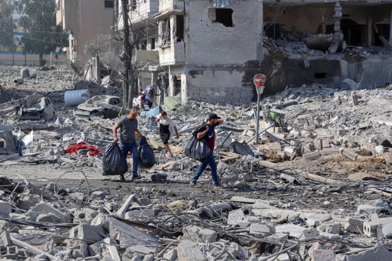10月10日,在加沙城,人們走過被以色列空襲炸毀的建筑廢墟。新華社發(fā)(里澤克·阿卜杜勒賈瓦德攝)