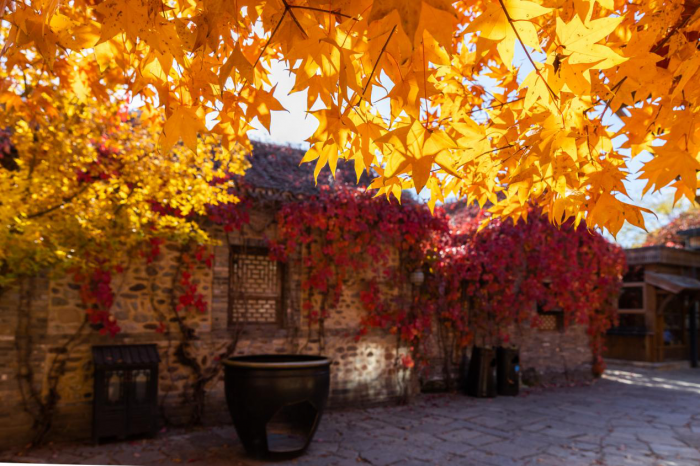 司馬缸酒樓座落在司馬小燒酒作坊和永順染坊的中間,是古北水鎮(zhèn)景區(qū)內(nèi)一家具有以酒缸為桌的特色餐廳。餐廳外的樹葉漸漸變得金黃、橙紅,像是一幅幅巨大的油畫掛在了樹枝上。