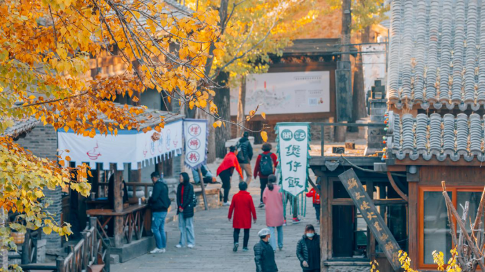 “緩緩飄落的楓葉像思念..."秋天適合思念,其實更適合在古北水鎮(zhèn)見面。金黃色的楓葉遮擋了天空,陽光透過葉片的縫隙灑下來,投下斑駁的光影,為望京街打造了一個秋日童話。