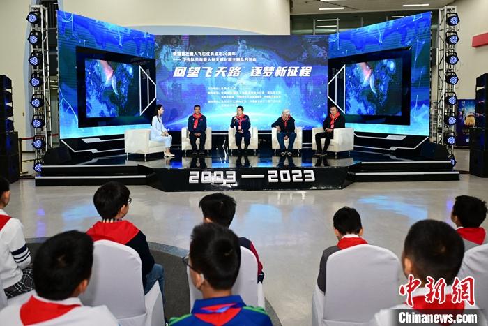 10月16日,中國首飛航天員楊利偉(右)與少先隊員們交流。當天,“回望飛天路 逐夢新征程”中國首次載人飛行任務(wù)成功20周年——少先隊員與載人航天面對面主題隊日活動在北京舉辦。 中新社記者 田雨昊 攝
