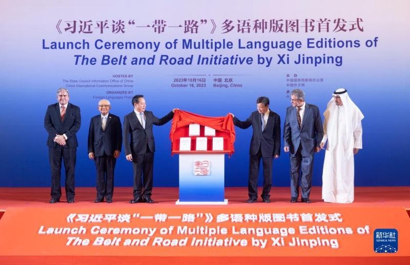 10月16日,《習(xí)近平談“一帶一路”》多語(yǔ)種版圖書(shū)首發(fā)式在京舉行,阿拉伯文、西班牙文、葡萄牙文、德文、日文版5種新書(shū)正式面向海內(nèi)外出版發(fā)行。這是中外嘉賓代表共同為《習(xí)近平談“一帶一路”》多語(yǔ)種版圖書(shū)揭幕。新華社發(fā)(陳建 攝)