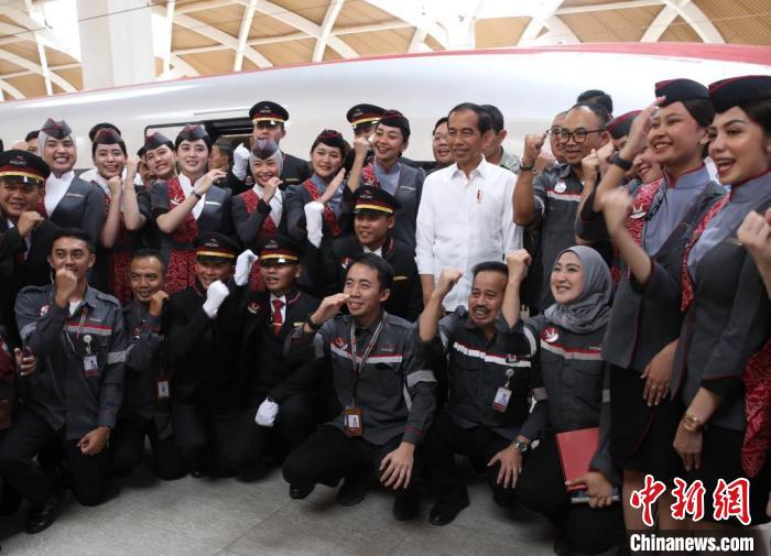 9月13日,印度尼西亞總統(tǒng)佐科考察中印尼合作項目雅萬高鐵,并在哈利姆站乘坐G5901次高鐵列車赴帕達(dá)拉朗站。這是他首次乘坐雅萬高鐵。圖為佐科在哈利姆站與乘務(wù)人員合影?!≈行律缬浾? 李志全 攝