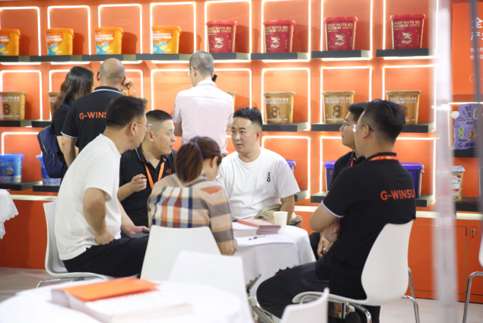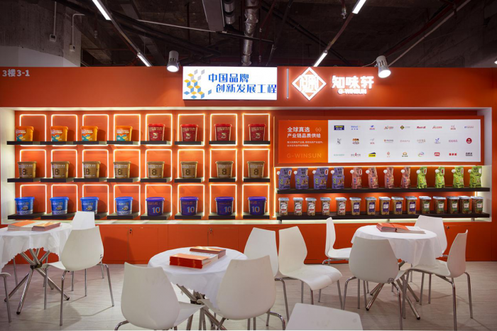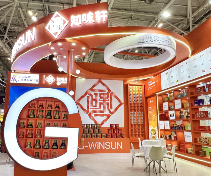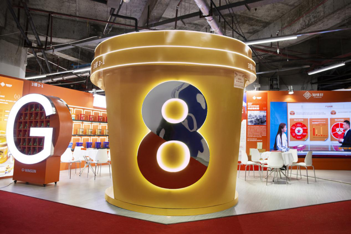 此外,在深圳國際會展中心主會場展位上,知味軒采用的是小罐拼成的logo墻以及代表品牌的“G”字異型陳列柜。兩大會場充分展現(xiàn)了“大桶+小罐”的設計元素,讓前來參展的經(jīng)銷商與消費者可以充分理解產(chǎn)品概念,為其打造了沉浸式逛展體驗。