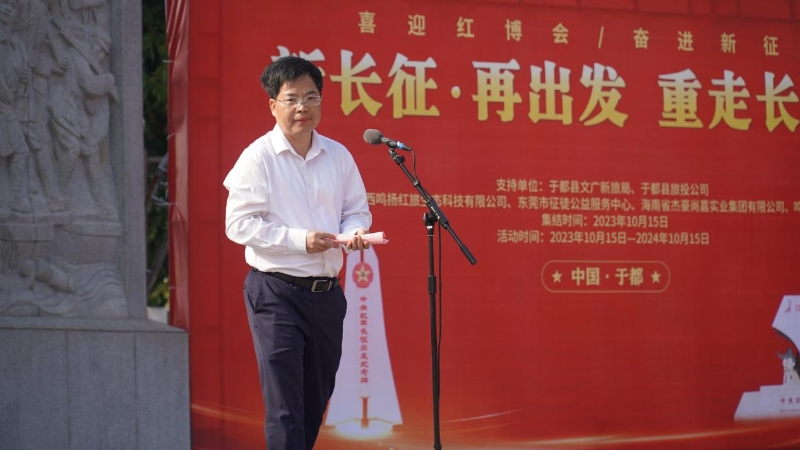 為紀(jì)念長征在于都集結(jié)出發(fā)勝利89周年,激勵(lì)人們弘揚(yáng)長征精神、傳承紅色基因、賡續(xù)紅色血脈、追憶崢嶸歲月,2023年10月15日上午,在江西省于都縣的中央紅軍長征出發(fā)地紀(jì)念碑前,一場盛大的“新長征.再出發(fā)”千人徒步重走長征路活動大型公益活動在于都順利舉行。屆時(shí),縣委宣傳部、縣文廣新旅局、中央紅軍長征集結(jié)出發(fā)歷史博物館、縣旅投公司等同志、東莞市征徒公益會員及江西鳴揚(yáng)紅旅公司員工及會員等千人同聚一堂,共赴盛會。此次活動由于都縣文廣新旅局與于都縣旅投公司聯(lián)合舉辦;江西鳴揚(yáng)紅旅生態(tài)科技有限公司、東莞市征徒公益服務(wù)中心、海南省杰豪尚嘉實(shí)業(yè)集團(tuán)有限公司、鳴揚(yáng)紅旅國際旅行社共同承辦。