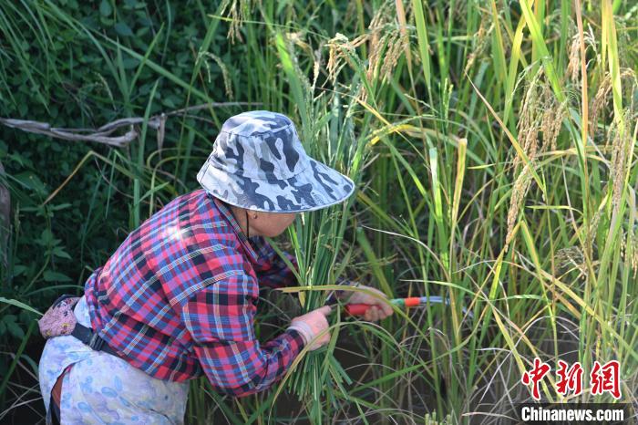 10月16日,云南德宏遮放鎮(zhèn)允午村農(nóng)民在田里收割巨型稻。中新社記者 李嘉嫻 攝