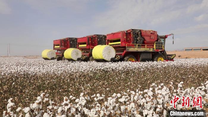 新疆庫車市棉花地里,一朵朵潔白的棉花一眼望不到頭,三臺大型采棉打包一體機來回穿梭作業(yè)。(王建強 攝)