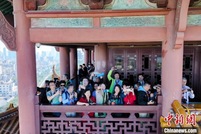 海外華文媒體代表登臨黃鶴樓?!翘蕴?攝