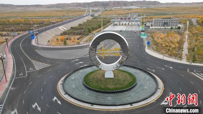 圖為位于金塔南收費(fèi)站入口前,帶有胡楊和古佛塔元素的“天空之鏡”建筑。(無人機(jī)照片) 九美旦增 攝