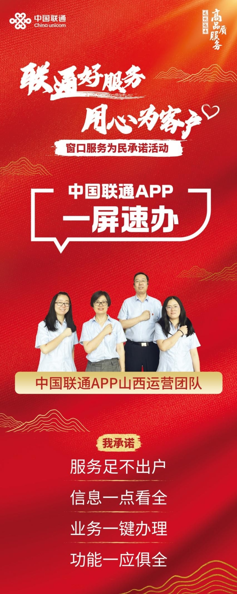自中國聯(lián)通攜手中國質(zhì)量萬里行促進會聯(lián)合發(fā)布“聯(lián)通好服務(wù) 用心為客戶”窗口服務(wù)為民承諾活動以來,山西聯(lián)通積極貫徹落實集團服務(wù)理念,承接集團服務(wù)承諾,結(jié)合本地實際,面向營業(yè)廳、智家工程師、政企客戶經(jīng)理、10010熱線、中國聯(lián)通APP五大服務(wù)窗口作出五項承諾,全面鍛造高品質(zhì)服務(wù),打造服務(wù)競爭新優(yōu)勢,擦亮山西聯(lián)通窗口服務(wù)形象。