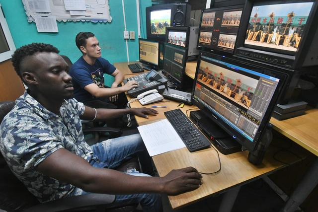 2022年9月22日,在古巴首都哈瓦那,古巴國家電視臺(tái)多視覺頻道的技術(shù)人員在演播室準(zhǔn)備播放中國紀(jì)錄片《我的鄉(xiāng)村故事》。
