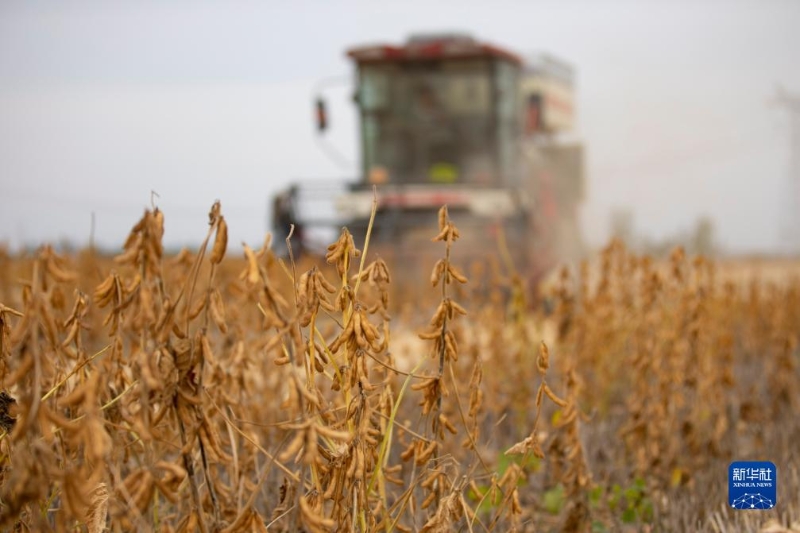 10月19日,在山東省東營市廣饒縣李鵲鎮(zhèn)西張莊村玉米大豆帶狀復(fù)合種植田里,農(nóng)民駕駛收割機收獲大豆。