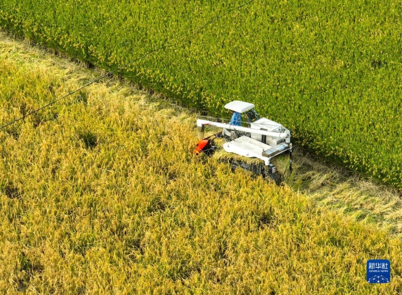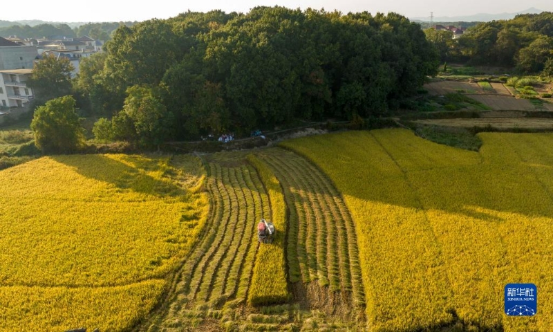 10月18日,在江西省九江市都昌縣汪墩鄉(xiāng)七星村,農(nóng)民駕駛農(nóng)機收割稻谷(無人機照片)。