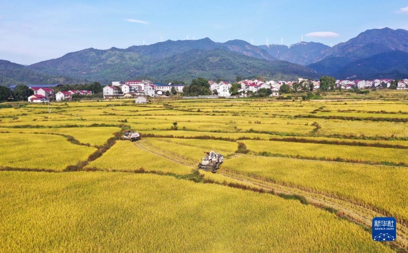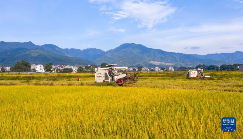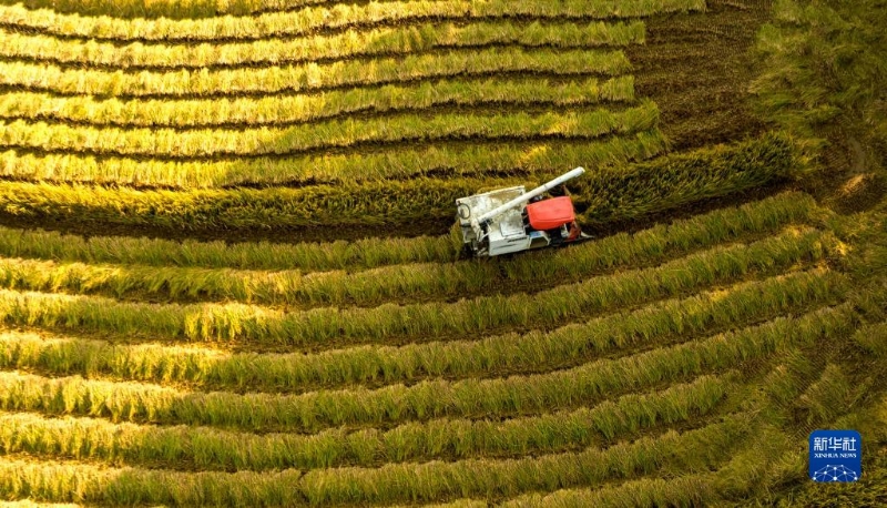 10月19日,浙江省臺州市仙居縣雙廟鄉(xiāng)農(nóng)民駕駛收割機收割稻谷。