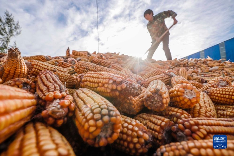 10月19日,河北省遵化市東新莊鎮(zhèn)農(nóng)民在場院堆放收獲的玉米。