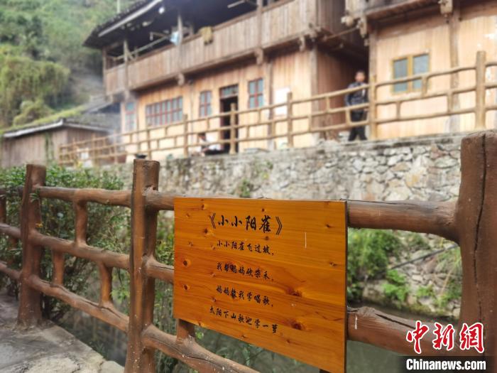 小黃村小學位于村寨的西北角,需要沿著一條小溪前行。行走其間,隨處可見寫有侗歌的木板掛在護欄上,比如《陽雀歌》:“小小陽雀飛過坡,我?guī)蛬寢尶巢窈蹋粙寢尳涛覍W唱歌,太陽下坡山歌也學一籮?!?/p>